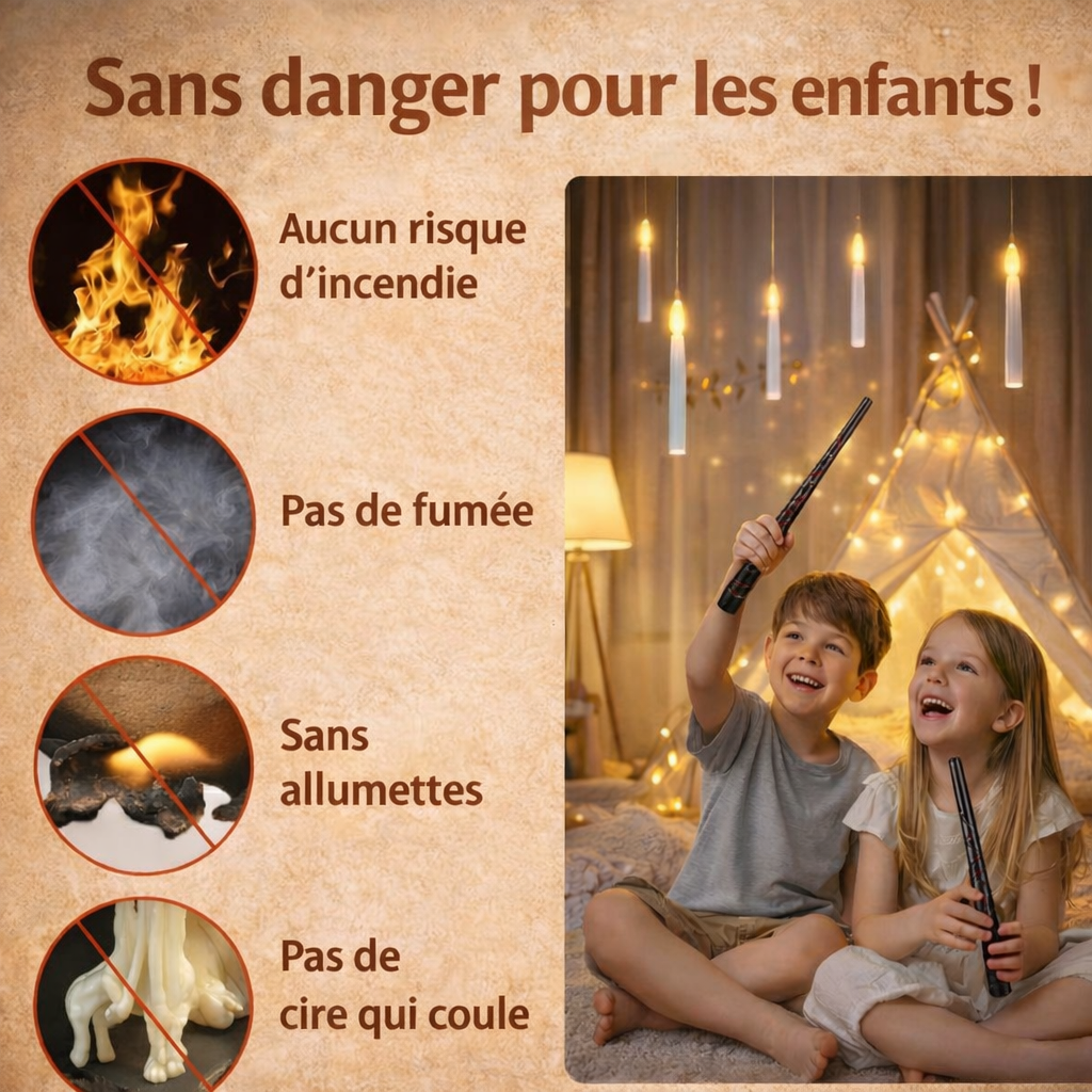 Le paquet comprend 12 bougies LED, une baguette magique (télécommande), 20 mètres de fil en nylon et des crochets transparents pour une installation simple et personnalisable.